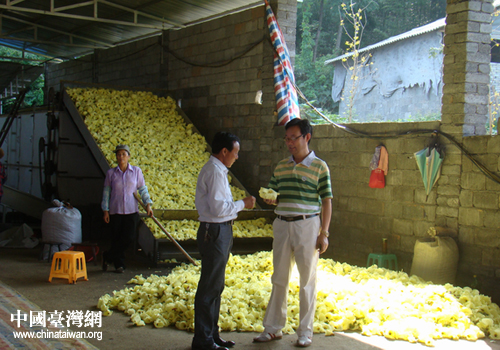 李树金向县台联顾问吴政介绍收购黄蜀葵花后集中烘干、销售情况。(图片来源:歙县台办)