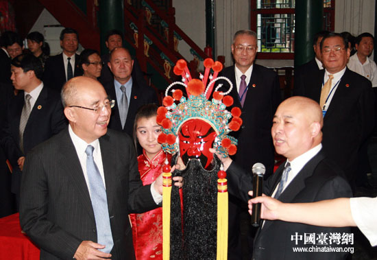 5月25日下午,中国国民党主席吴伯雄率领中国国民党大陆访问团一行来到北京湖广会馆参访,图为吴伯雄接受湖广会馆馆长霍建庆赠送的关公脸谱。(中国台湾网 钟宝华 摄)