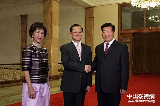 7月27日下午,中共中央政治局常委、全国政协主席贾庆林在北京人民大会堂北京厅会见了来访的中国国民党荣誉主席连战一行。(中国台湾网 钟宝华 摄)