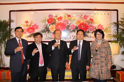 海峡两岸民意代表联谊会长饶颖奇(中)全国政协副秘书长杨崇汇(右二)鑫福茶轩董事长李和鑫(左二)合影留念