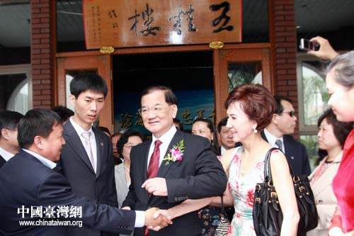 中国国民党荣誉主席连战,中共中央政治局委员、中共北京市委书记刘淇,全国政协副主席、台盟中央主席林文漪,中共中央台办、国务院台办主任王毅等在五桂楼前合影留念。(中国台湾网 董洁 摄)