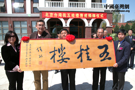 中国台湾网5月6日北京消息 北京台湾街标志性建筑“五桂楼”落成揭牌仪式6日在北京举行。海峡两岸关系协会副会长张铭清,北京市台办、石景山区人民政府有关领导,以及专程来京的台中县长黄仲生、台湾雾峰林家代表林芳瑛等十余位林家后人,出席了揭牌仪式。