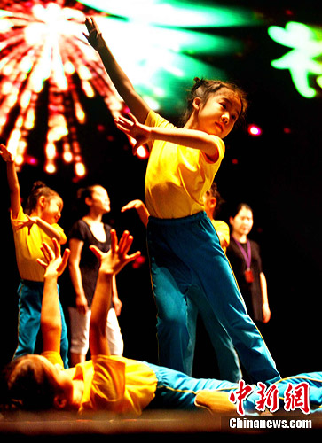 7月28日下午,北京蓝天儿童艺术团的孩子们在台北紧张彩排,当晚将进行公益演出大型歌舞情境剧《十二吉祥》,支持台湾中南部灾区农业重建。中新社发 宋吉河 摄