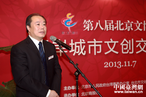 北京市台办副主任黄塞溪在第八届北京文博会两岸城市文创交流酒会上宣布,为进一步深化两岸文创交流与合作,北京市相关文化单位推出三项新举措。(中国台湾网 王伟 摄)