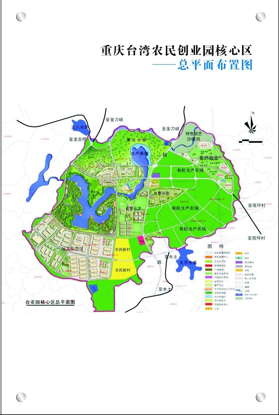 重庆台湾农民创业园是2006年经国家农业部、国台办批准设立的首批四家台创园之一。选址于具有500年花卉种植历史的“中国花木之乡”——北碚区静观镇,位于重庆主城北部,毗邻两江新区,距重庆解放碑59公里、江北国际机场32公里、北碚城区21公里。园区产业规划面积14平方公里,其中,核心区4平方公里(包括1平方公里的城市建设用地),拓展区10平方公里,辐射区200平方公里,分为六个功能区,即瓜果蔬菜示范区、花卉苗木展示区、研发良繁示范区、风情观光及管理服务区、农产品加工示范区、集中居住示范区。园区坚持“以台为主、以农为主”的发展定位,重点引进现代特色休闲农业、农业高科技成果,打造以特色园艺和花卉苗木展览展示、观赏体验为主的现代农业旅游景区,形成集旅游观光、研发繁育、种植示范为一体的都市城郊型现代农业示范园。