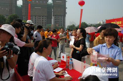 中国台湾网8月30日合肥消息 8月26日上午,由安徽省台办、省国资委、省工商联、省红十字会联合主办的“两岸一家亲?皖台传真情”大型集中捐赠活动在合肥和平广场举行,安徽省内70多家爱心企业和数百市民纷纷赶到现场进行捐款。安徽省政府副秘书长张武扬、省台办主任朱德祥、省国资委副主任吴经华、省工商联副主席耿学梅、省红十字会常务副会长王强、省红十字会专职副会长马元淮等出席了活动。