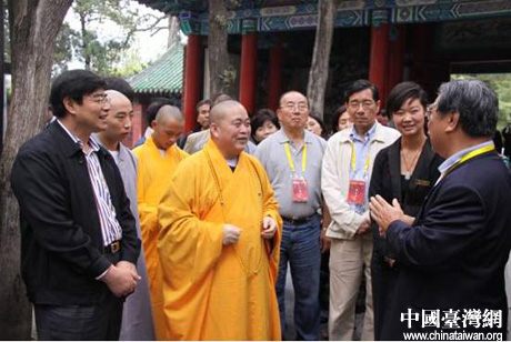 观礼团成员与少林寺方丈释永信交流 图片来源:河南省台办