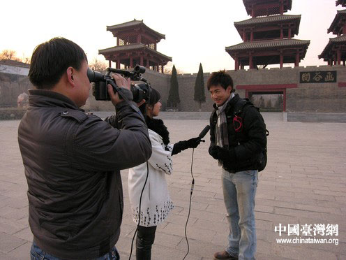 中天电视台主持人在函谷关前接受三门峡电视台记者的采访。图片来源:三门峡市台办