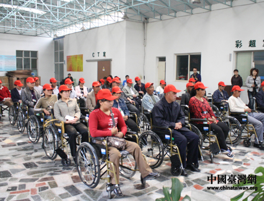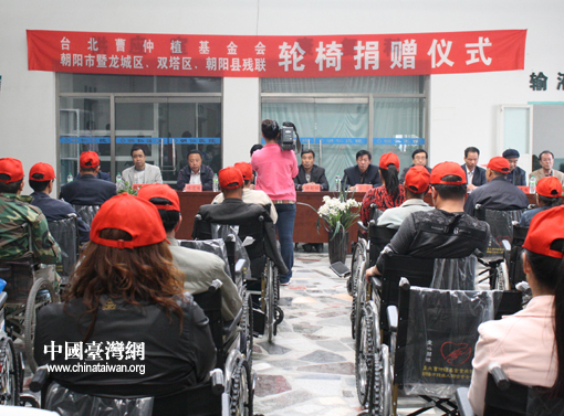 中国台湾网5月18日朝阳消息 我国第20个“全国助残日”(5月的第三个星期日)即将到来之际,台湾金山曹仲植基金会向朝阳市肢残人捐赠轮椅仪式在龙城区二院举行,金山曹仲植基金会代表将325辆轮椅捐赠给朝阳的肢体残疾人。
