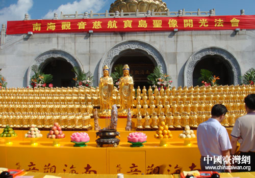 中国台湾网9月19日舟山消息 日前,普陀山佛教协会在观音圣地浙江普陀山南海观音大佛广场举行了隆重的“南海观音慈航宝岛”圣像开光法会,为即将于27日启程送往台湾观音“四大法脉”月眉山、法云寺、观音山、大岗山千处寺院敬奉的1000尊南海观音像开光。