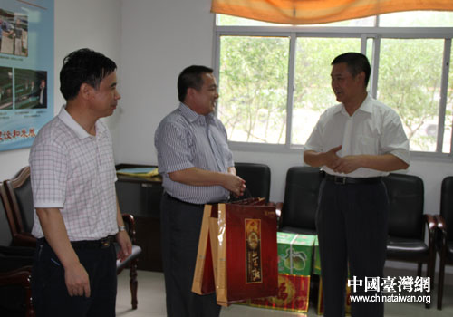 中国台湾网9月25日消息 中秋前期,湖北省十堰市政协副主席王庆华一行在十堰市台办主任曹奎、副主任郭升平的陪同下来到台企阿里山公司,看望慰问在那里投资兴业的台湾客商赖昶浚父子及专职茶叶师傅三人,了解台商们在十堰的工作、生活情况,为他们送去了中秋月饼和节日祝福。