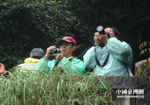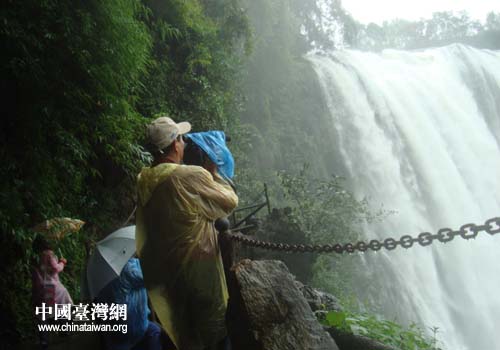 距大瀑布还有数里之遥,就看到大瀑布冲击阵阵水雾从峡谷中涌出,伴随隆隆水声,记者们已感受到大瀑布的雄壮。有几位女记者指着水雾漫起的地方,惊呼道:大瀑布在那边!大家通过瀑布对面半山腰的观光便道向瀑布方向走去,才看到瀑布露出部分就被吸引住了。《联合报》记者黄宏玑、《中国时报》记者沈挥胜、《台湾新闻网》记者许振泽对着瀑布不停地举起相机、摄像机。走到瀑布正面,只见蓝色的河水顷刻间变成近百米宽的白色水幕,从数十米高的悬崖上如万马奔腾飞驰而下,猛烈地撞击着谷底深潭,发出雷鸣般的吼声,溅起冲天的水雾,情景壮观极了。半山上风大,此时,风夹着雨、雨伴着水雾,分不清是雨水还是雾水。惊喜的记者们身着雨衣,忙着给瀑布照相、摄影,忙着与瀑布合影。《人间福报》记者林艺斌,是台湾著名的360度摄影大师,他到过黄果树大瀑布多次了。他曾在安顺二十多天,拍摄山水风光、民族风情,之后,安顺台办编辑出版了《安顺三百六十度摄影》,在大陆台湾受到高度评价。林大师感慨道:“太美了,来了好多次了还是看不够,到过黄果树大瀑布的人,没有谁说不震撼!”