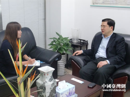 台湾经济日报记者何蕙安在成都采访高新区发展策划局局长汤继强。图片来源:四川省台办