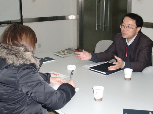 台湾经济日报记者何蕙安在绵阳采访四川长虹电器股份有限公司企业策划部部长刘海中。图片来源:四川省台办