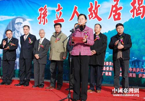 庐江县长刁吉润在揭牌仪式上致辞。她表示,孙立人将军是从庐江县金牛山走向世界的著名抗日将领,他两次挥师入缅,取得了卓越战功,被国际盛赞为“东方的隆美尔”、“丛林之狐”。在将军诞辰110周年之际,修缮和保护将军故居,就是为了不断发扬将军顽强拼搏、自强不息的宝贵精神,传承两地人民的血缘亲情,增进两岸同胞的相互了解,深化两岸交流与合作。庐江与台湾虽相隔千里,但有着割舍不断的情缘。近年来,台商来庐江投资日渐增多,庐江不仅建有台商工业园,郭河台湾农民创业园也正在加快建设。庐江将挖掘开发当地丰富的人文旅游资源,集山水人文之“灵”,聚经济发展之“魂”,逐步将庐江打造成合肥经济圈、皖江城市带的“会客厅”及合肥的卫星城。