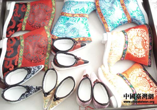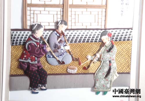 陶玉英老人布贴画具有很强的东北特色,特别是陶老制作的三寸金链,更让台湾朋友看得爱不释手。