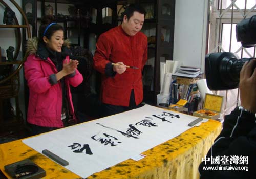 辽砚传人章永军为台湾记者们即兴挥毫泼墨“台湾脚逛大陆”(图片来源:本溪市台办)