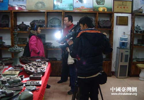 中国台湾网12月27日本溪消息 22日,台湾中天电视《台湾脚逛大陆》节目组一行四位记来到了辽宁省本溪市辽砚最大的生产基地进行采访。本溪市台办副主任范艺陪同采访。