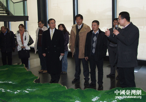 本溪市市长助理、开发区党工委书记于海向台湾基亚生物科技股份有限公司董事长张世忠一行介绍本溪“药都”的整体规划情况(图片来源:本溪市台办)