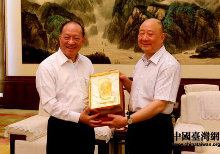 湖北省副省长田承忠(右)会见台湾肥料股份有限公司董事长钟荣吉(左),图为两人交换礼品。(湖北省台办 朱琨 摄)