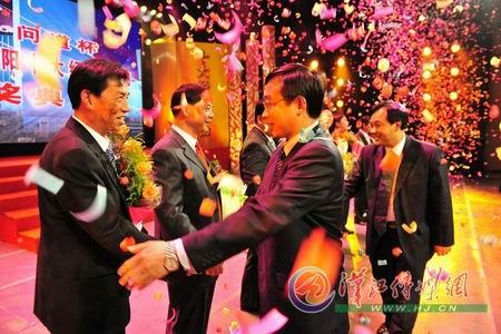 襄阳市委书记李新华(右二),副书记、市长别必雄(右一)为刘国本(左一)等十大经济人物颁奖(资料图片)