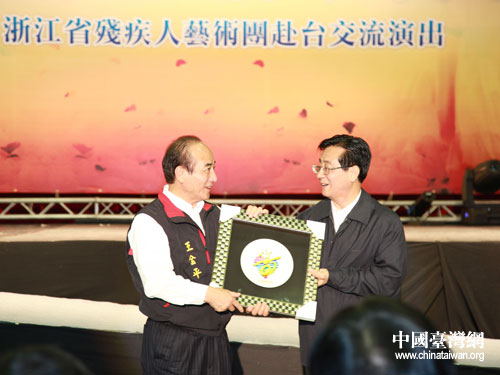 台湾无障碍协会名誉理事长王金平向赵洪祝赠送纪念品。(浙江台办王健 摄)