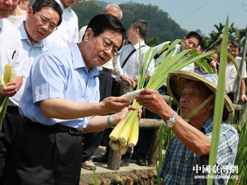 南投县的茭白笋产量为全台之冠,埔里镇生产的茭白笋又占了该县总生产量的七成以上。在埔里镇向善里的蔬菜产销班第七班水田里的茭白笋长势旺盛,植株高大,一位茭农正顶着大太阳忙着收割。赵洪祝来到水田边,一边剥着茭白笋壳,一边与老农交谈。老农告诉赵洪祝,产销班通过技术革新,增加了夜间的灯光照射,刺激茭白笋生长,现在一年四季都可以有产出,农民收入也增加了。他递给赵洪祝书记一把茭白笋,告诉书记,这里的水质好,没有污染,茭白笋收割后,马上可以生吃。赵洪祝当即剥开一支,品尝起来:“真甜!”书记赞口不绝。