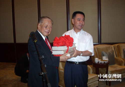 浙江温州市委副书记朱贤良致赠台北市温州同乡会理事长林亦冲《温州市志》一套(温州市台办 王微芳 摄)