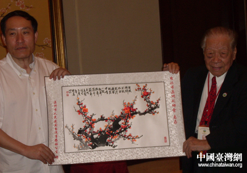 温州市台办主任胡侠致赠林亦台北市温州同乡会理事长林亦冲精美瓯绣一幅(温州市台办 王微芳 摄)