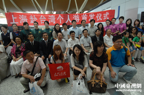 中国台湾网6月28日上海消息 今天上午,上海首批赴台个人游的25名旅客在上海浦东国际机场乘坐东航FM801航班于9:35飞往台北。这批上海国旅等5家旅行社受理的游客登机前举行了启程仪式,上海市旅游局、市台办、旅行社、东方航空、长荣航空的代表前往送行。