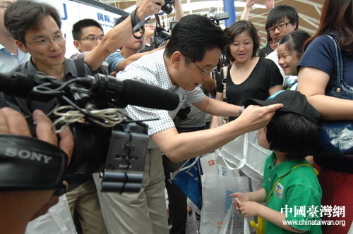 上海台办副主任顾洪辉向小游客赠送纪念品(图片来源:上海市台办)
