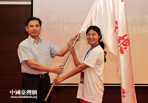 西北农林科技大学副校长侯曦会将“同根·同源”暑期交流活动营旗授予学生代表(图片来源:陕西省台办)