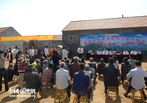 中国台湾网9月27日潍坊消息 日前,驻潍台商“爱心捐赠”活动走进山东省潍坊市临朐县沂山镇禅寺院村,高密亚泰木业和潍坊市台资企业协会将40套实木桌椅和37台液晶电视送到37户老年人家中,此外,九九重阳节即将到来,潍坊市台资企业协会还给老人送去红包。
