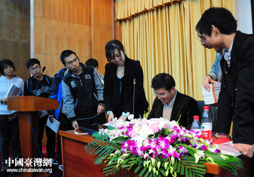 中国台湾网11月14日大连消息 日前,台湾青年作家廖信忠做客大连海洋大学“蓝色讲坛”,举行了《我们台湾这些年》书友见面会。该校300多名师生参加此次书友见面会。