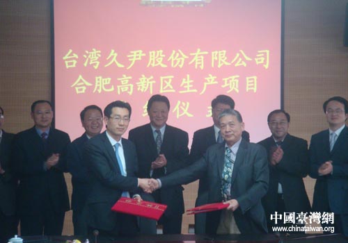 中国台湾网4月25日合肥消息 日前,台湾久尹股份有限公司合肥高新区生产项目正式签约。市台办主任徐延安、高新区管委会副主任王连贵等出席签约仪式。