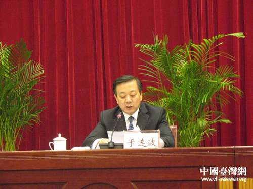 威海市台办主任于连波做工作报告(图片来源:威海台办)
