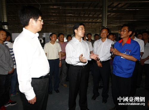 四川省副省长甘霖一行在遂宁市台商电子产业园调研台资企业立华新进公司。(图片来源:遂宁台办)