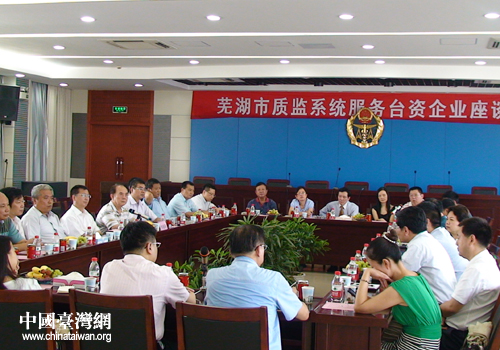 中国台湾网7月19日芜湖消息 日前,芜湖市台办会同市质监局召开了“芜湖市质监系统服务台资企业座谈会”,市台商协会会长陈鉴章率15家在芜台资企业董事长、总经理等20余人参加座谈。