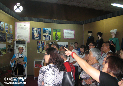 台湾的少数民族团员们参观了三都水族博物馆,观看了水族的水书、服饰等民俗文化展览,了解了当今的水族同胞,写水书、说水语、用水历、着水衣、唱水歌、跳水舞,传承着淳厚的水族风俗习惯。被誉为象形文字“活化石”的水书,至今广为使用。水族的端节、水书、马尾绣被列为国家级首批非物质文化遗产名录。