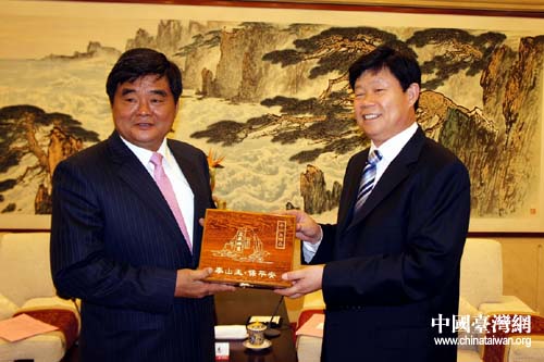 山东省副省长贾万志会见台湾省商业总会理事长张荣味一行,图为赠送礼品。(图片来源:山东省台办)