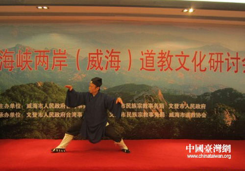 中国台湾网9月20日威海消息 9月18日,第三届海峡两岸(威海)道教文化研讨会在文登市举行。台湾正宗全真道教会理事长、全真正宗龙门派第二十六代传人巫平仁观主率团来威海参会,并在研讨会上表演了一套弘道养生太极拳,弘扬传统道教文化。(中国台湾网、威海市台办联合报道)
