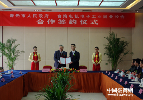 中国台湾网12月5日寿光消息 12月3日上午,寿光市人民政府—台湾电机电子工业同业公会合作签约仪式举行。台湾电电公会将协助寿光市建立能源网、运筹网系统,积极开展节能减排,助力寿光市转型升级。台湾电电公会秘书长陈文义、市领导赵绪春、刘广斌出席。