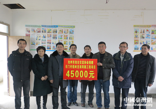 日前,池州市池台交流协会会长殷秀娥携部分台资企业负责人、台商一行5人专程来到贵池区棠溪镇石门村,捐资4.5万元用于该村低岭至青阳县南阳路工程项目。此次捐资活动得到了安徽鸿业集团有限公司、池州市泰鼎矿业开发有限责任公司等6家台资企业的鼎力支持。