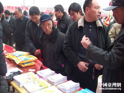商丘市睢阳区台办联合区科技局组成“科技下乡服务队”到火神台庙会,向台属赠送科技书藉。(图片来源:商丘市睢阳区台办)