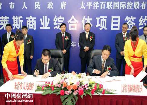 东营市人民政府、太平洋百联国际控股有限公司奥特莱斯商业综合体项目签约仪式。(图片来源:东营市台办)
