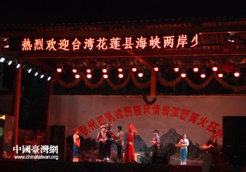 中国台湾网4月12日黔西南消息 日前,“两岸民族一家亲”文艺晚会在贞丰县贵峰宾馆布依广场隆重上演。漂亮的布依族姑娘、英俊的布依小伙唱起了多情动听的布依山歌,跳起了欢快的民族舞蹈欢迎从远方而来的花莲县海峡两岸少数民族交流协会的客人。