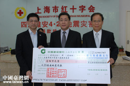 中国台湾网4月29日上海消息 28日下午,上海市台湾同胞投资企业协会会长叶惠德来到市红十字会,代表上海台协广大会员企业向四川芦山地震灾区捐赠人民币100万元。上海市台办主任李文辉出席活动现场。