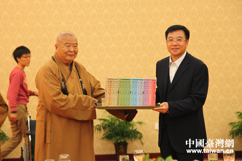 星云大师向葫芦岛市委书记孙兆林赠送亲笔签字的图书。(图片来源:葫芦岛市台办)