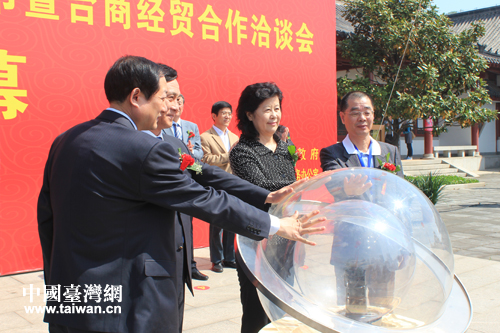 张雪燕与出席开幕式的领导同志和台商代表共同按下水晶球。(图片来源:泰安市台办)