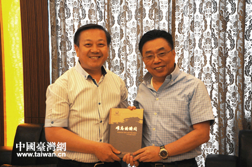 威海市台办主任于连波与东莞台商会馆大楼董事长郭山辉互赠纪念品。(图片来源:威海市台办)